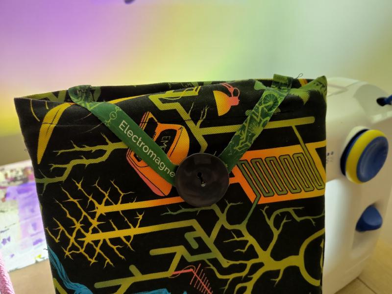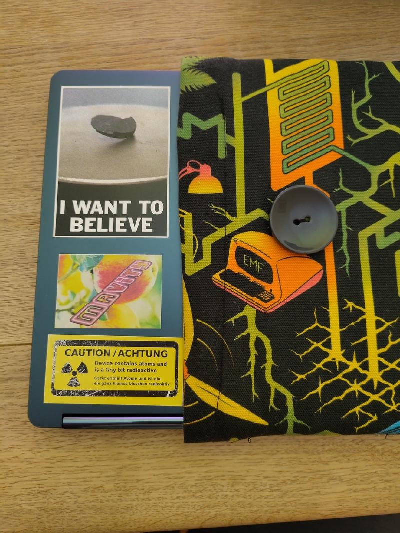 I was very pleased with the results, which were essentially the result of stitching together two pieces of Morag’s fabric after adding some internal padding. I used felt for the padding, since it was nice and soft (so wouldn’t scratch the laptop) and easy to stitch through. Even then I broke a couple of needles due to being a total sewing newbie. I was particularly excited about being able to re-use the EMF wristband as the sleeve closer, along with an old button I happened to have lying around: